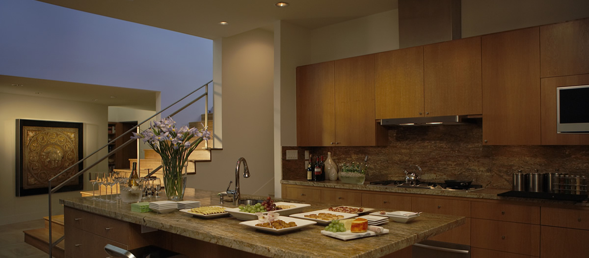 Kitchens are the central hub of the home and you can easily change the ambiance of the space for cooking, cleaning, entertaining, doing homework, or reading. Imagine pressing “Prepare” and your favorite music playlist comes on, shades raise to fill the room with sunlight, and counters brighten accordingly. You can keep an eye on the kids from the touch screen or see who’s at the door when the doorbell rings. Simply use the intercom from the same control to tell them dinner is ready instead of shouting. Keep counters clear and focus on the granite countertops, Viking range or Sub-Zero refrigerator, not the wires, speakers or TV.